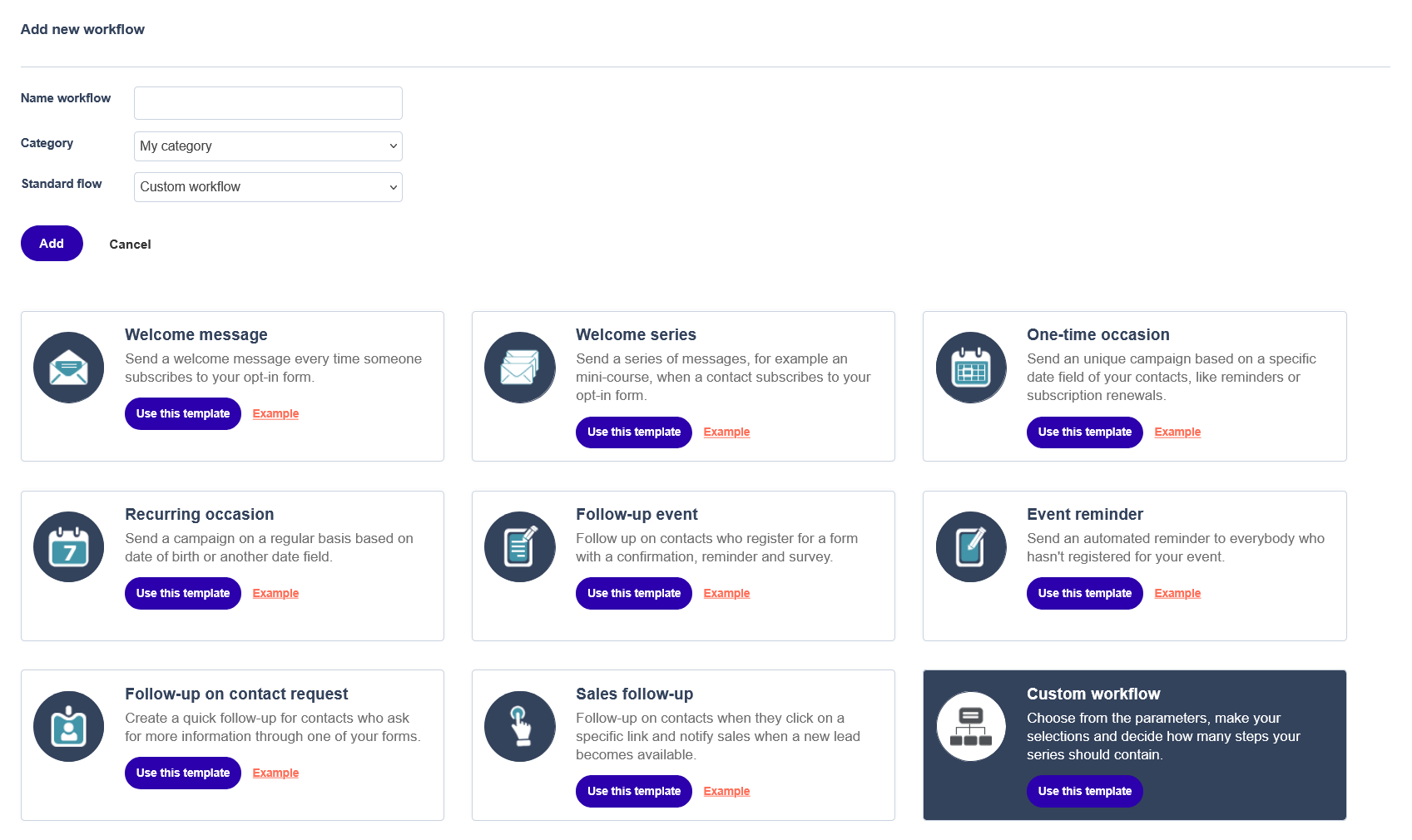 Templates provide a pre-assembled block sequence for common scenarios like welcome series and event follow-ups.