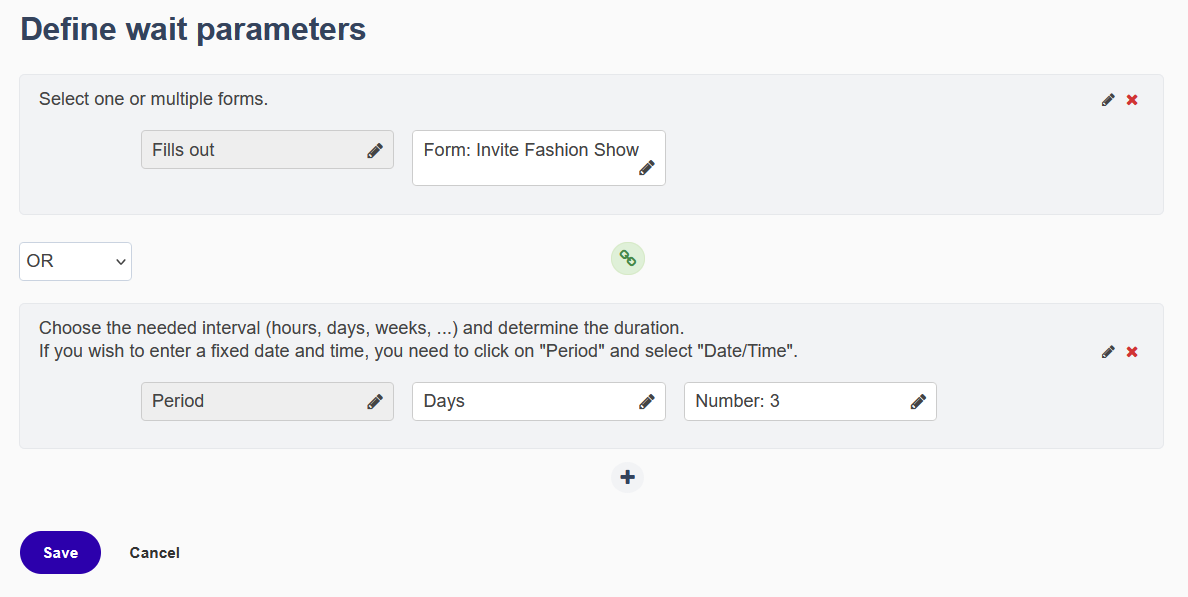 - Choose between Date for waiting for a fixed time (minutes, hours, days, weeks) or waiting until a condition is met.
