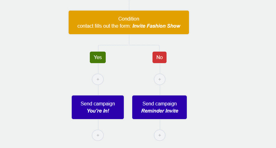 - Two paths appear: Yes (condition met) and No (condition not met). Add subsequent blocks to each path independently.