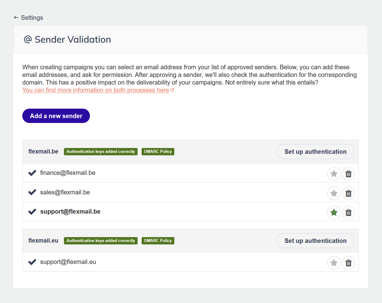 - If you manage multiple brands from one Flexmail account, set up separate validated sender addresses for each brand. This keeps each brand's reputation and recognition separate.