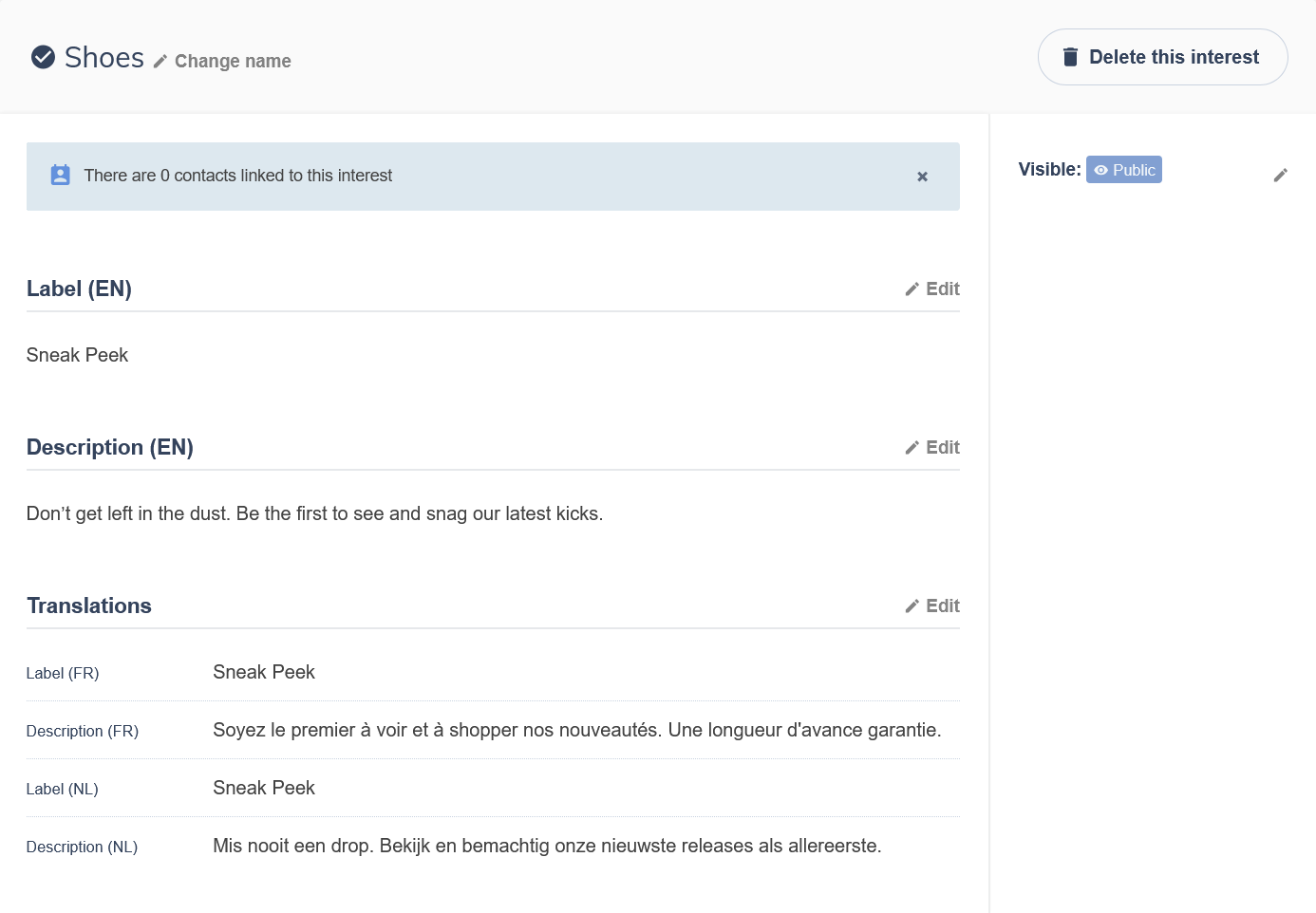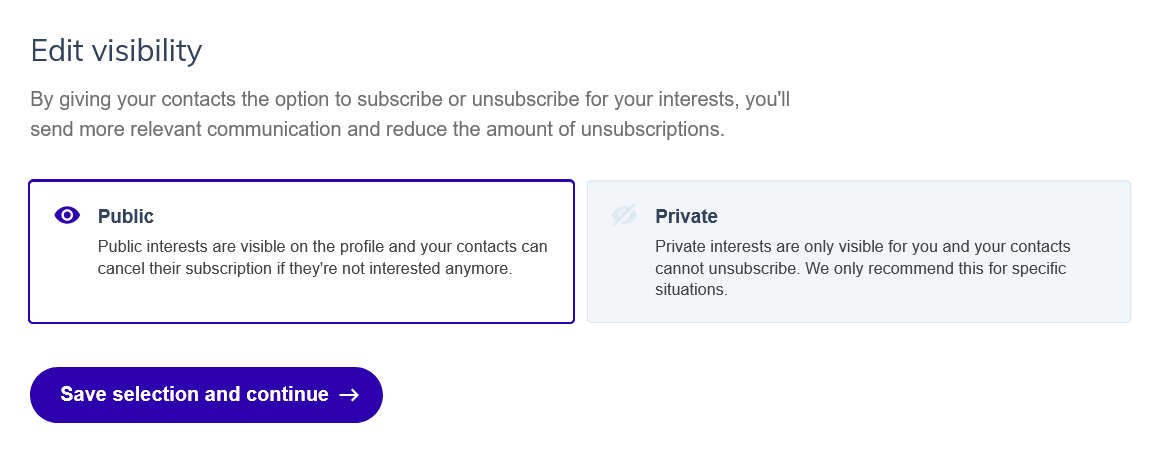 Public interests are visible to your contacts on their profile page and on your opt-in forms. Contacts can subscribe to or unsubscribe from them themselves. Use public interests for content categories you want contacts to opt into: newsletters, promotions, product updates, event invitations.