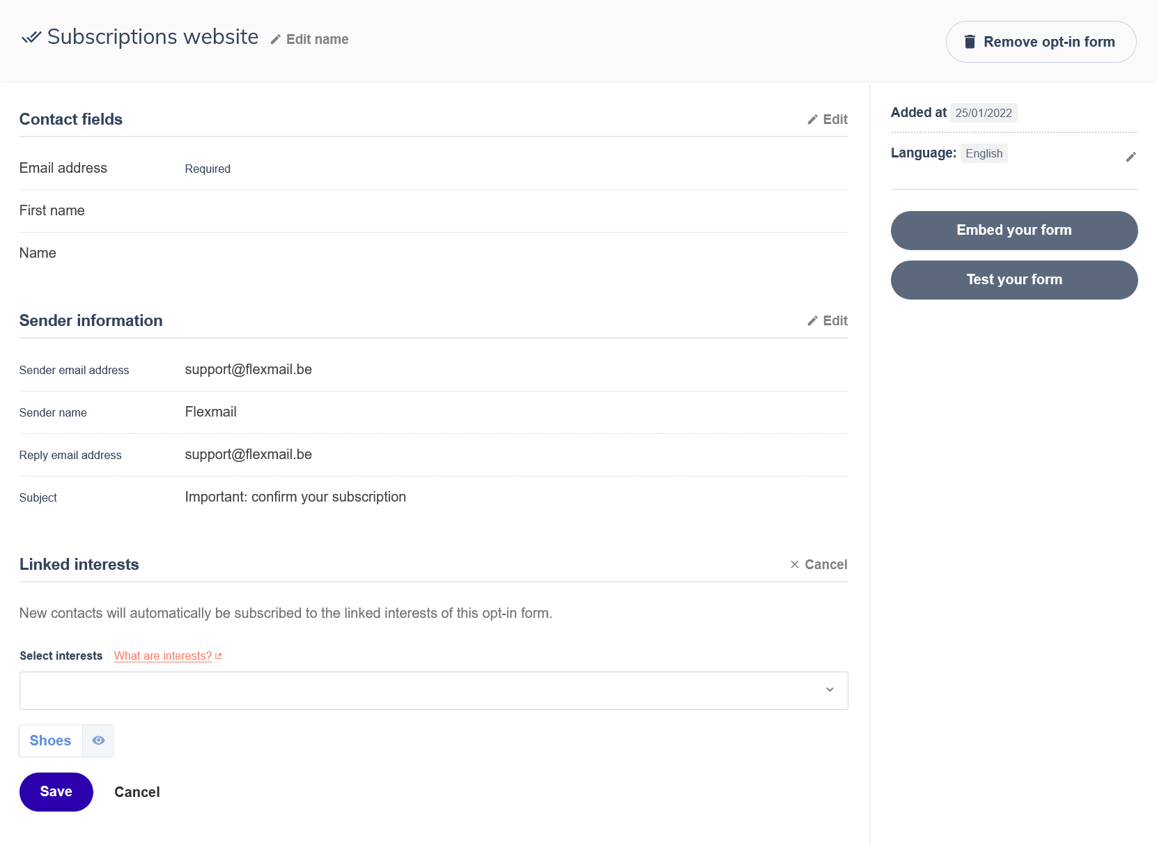 - If you send in multiple languages, add translations for the label and description. You only create the interest once; Flexmail automatically shows the correct language version to each contact.