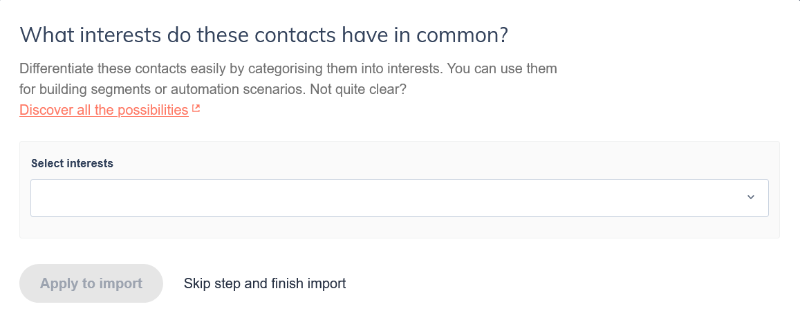 If you're importing a group of contacts who should all share the same interest — for example, all your existing newsletter subscribers — you can assign an interest to the entire import batch in the final step of the import flow. No extra column needed in your file.