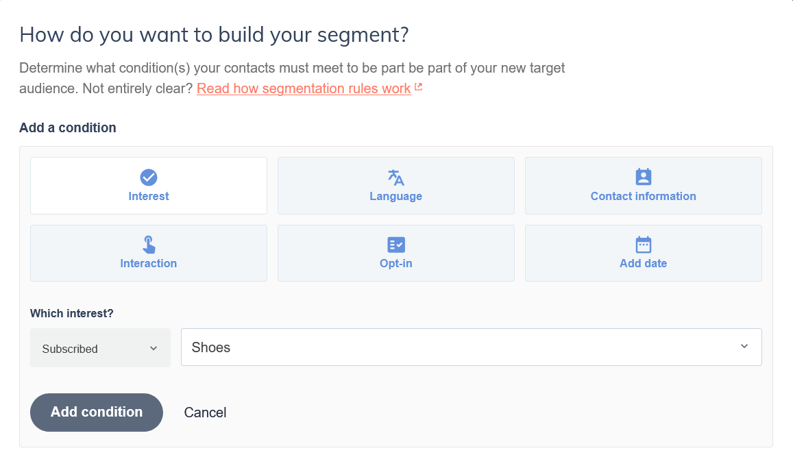 With your contacts in the right interests, create at least one segment per interest so you can send targeted campaigns. Go to Contacts → Segments and add a condition: Interest → Subscribed → [interest name].