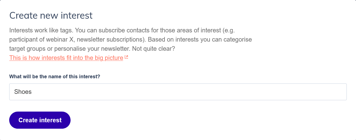 - Add a label and optionally a description. The label is the name contacts will see on their profile page and in opt-in forms. The description helps contacts understand what they're signing up for, for example: "Our monthly newsletter with tips and news". A description is optional but strongly recommended for public interests.