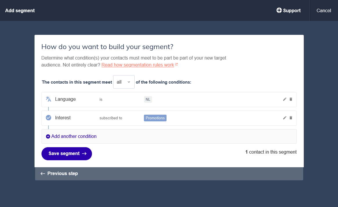 A segment can be as simple as one condition, for example all contacts whose language is Dutch. But when you have richer contact data, combining multiple conditions lets you build much more precise target groups.