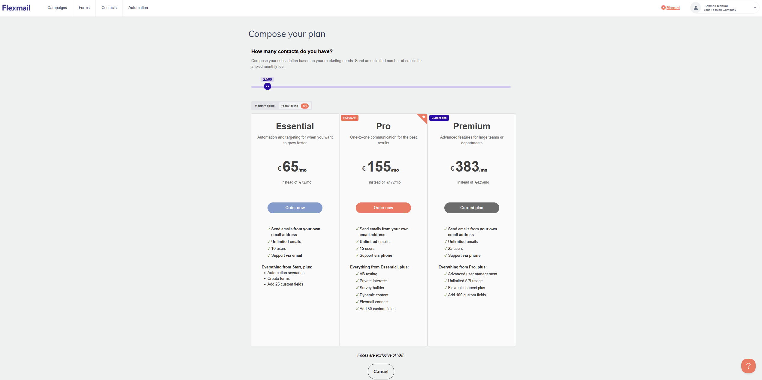 - Read "About the Flexmail subscriptions" for information on upgrading, cancelling, and switching between billing types