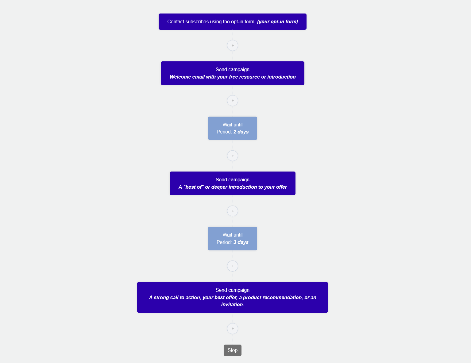 - Send block 2: A "best of" or deeper introduction to your offer. Timing: immediately after wait.