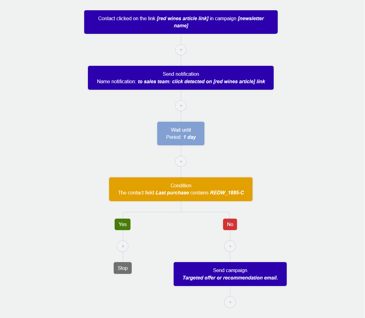 - Start block: Contacts who clicked link [red wines article link] in campaign [newsletter name].