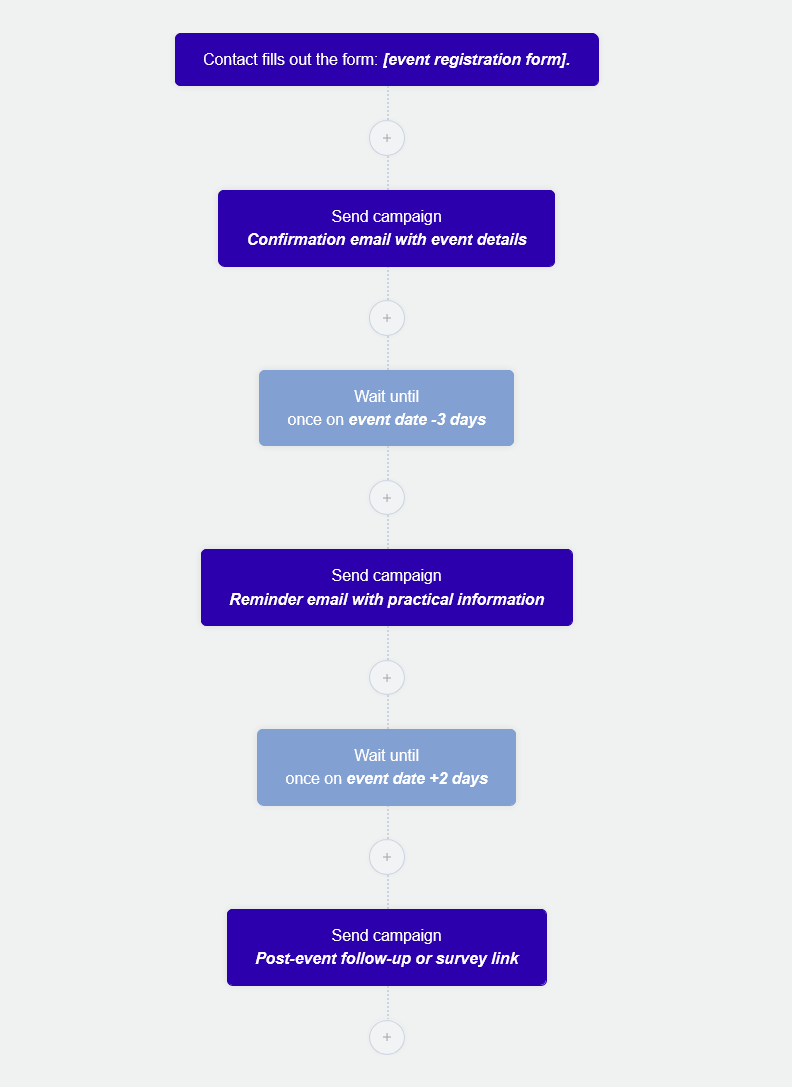 - Send block 3: Post-event follow-up or survey link. Timing: immediately after wait.