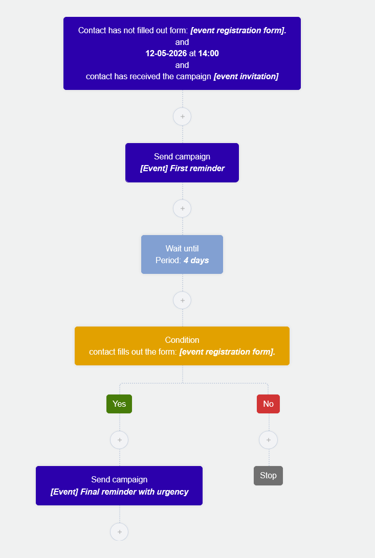 Support tip This workflow pairs well with the Event reminder workflow (example 5). One handles registered contacts; the other handles contacts who received the invitation but haven't registered yet.