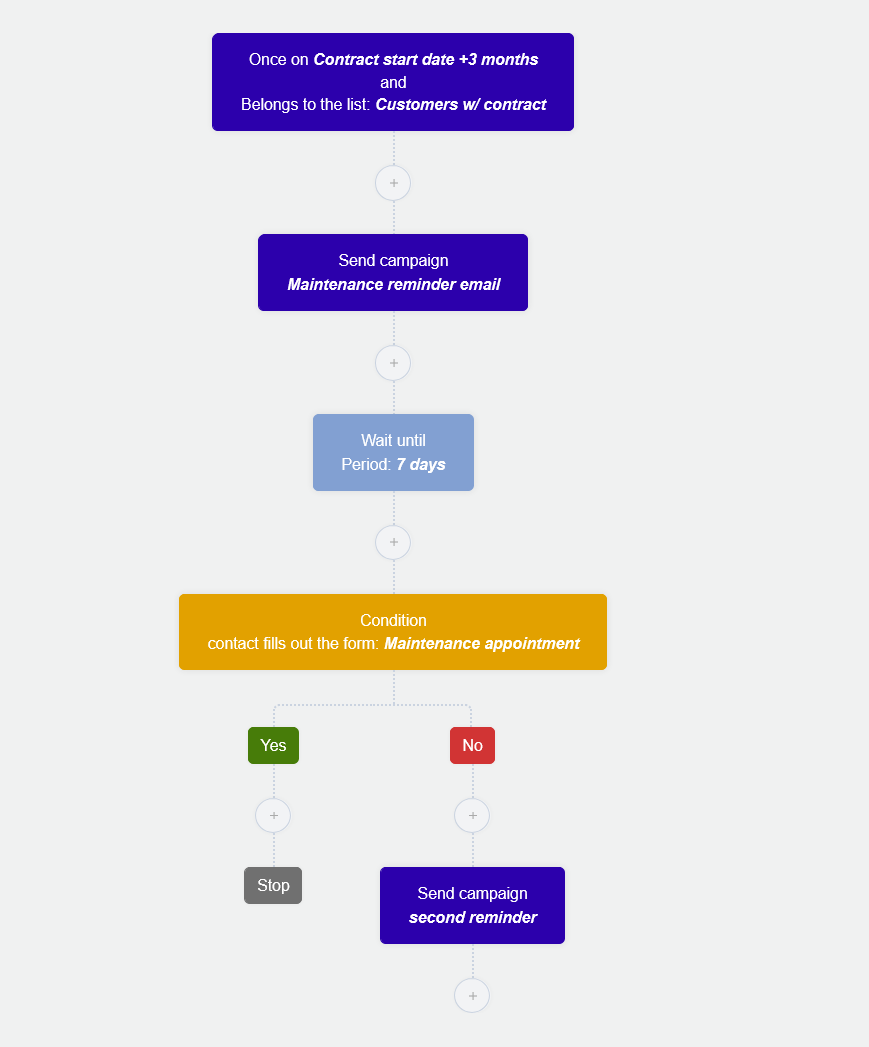 - If/else block: Has the contact booked the maintenance appointment? (Check via a custom field or form completion.)