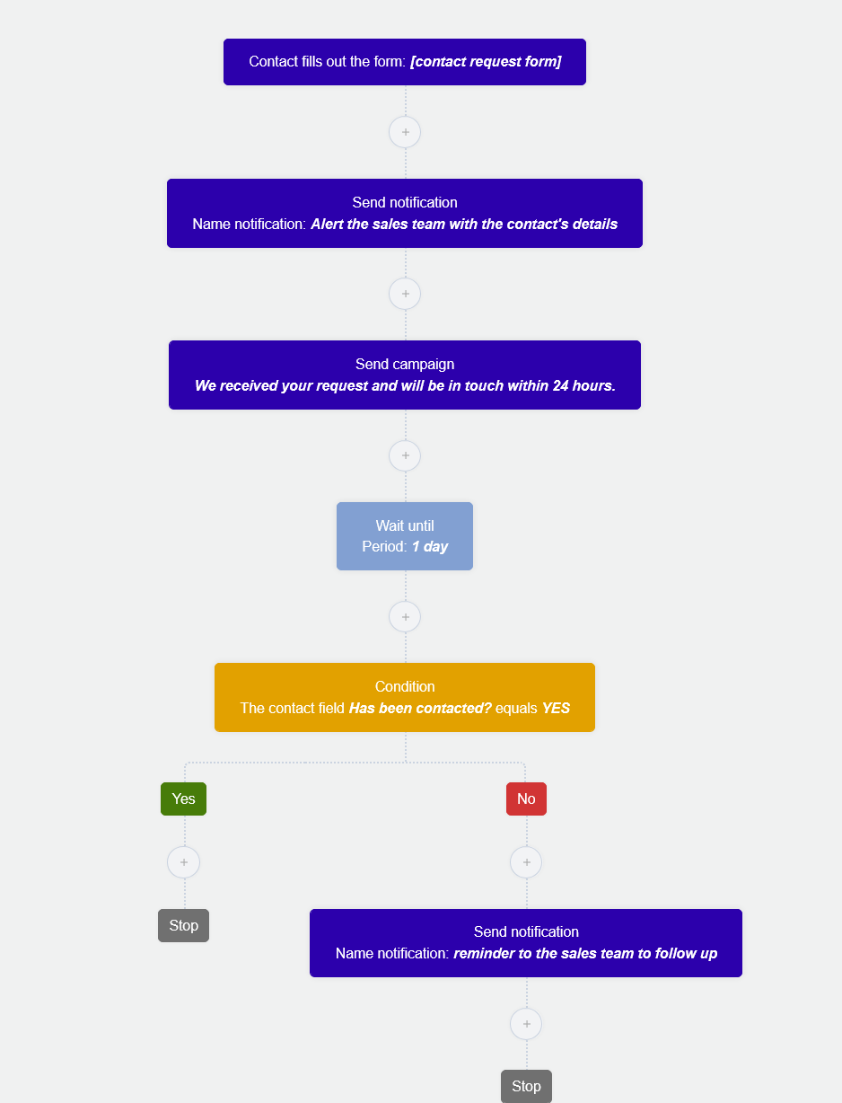 Support tip The internal notification block is the key ingredient here. It turns your marketing automation into a bridge to your sales team, the contact gets an immediate automated response, and your team gets an immediate alert to follow up personally.