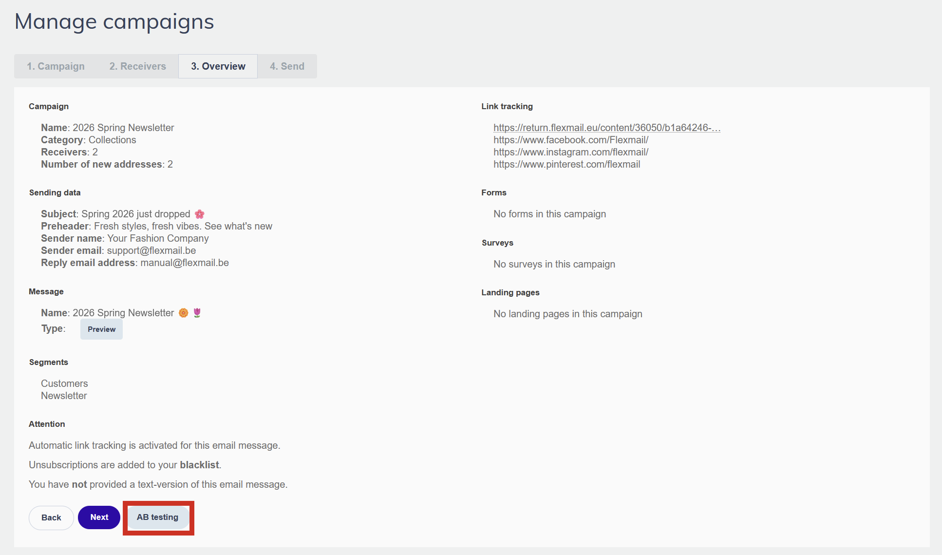From the campaign overview page (step 3 of the campaign creation flow), click the AB testing button before proceeding to the sending options.