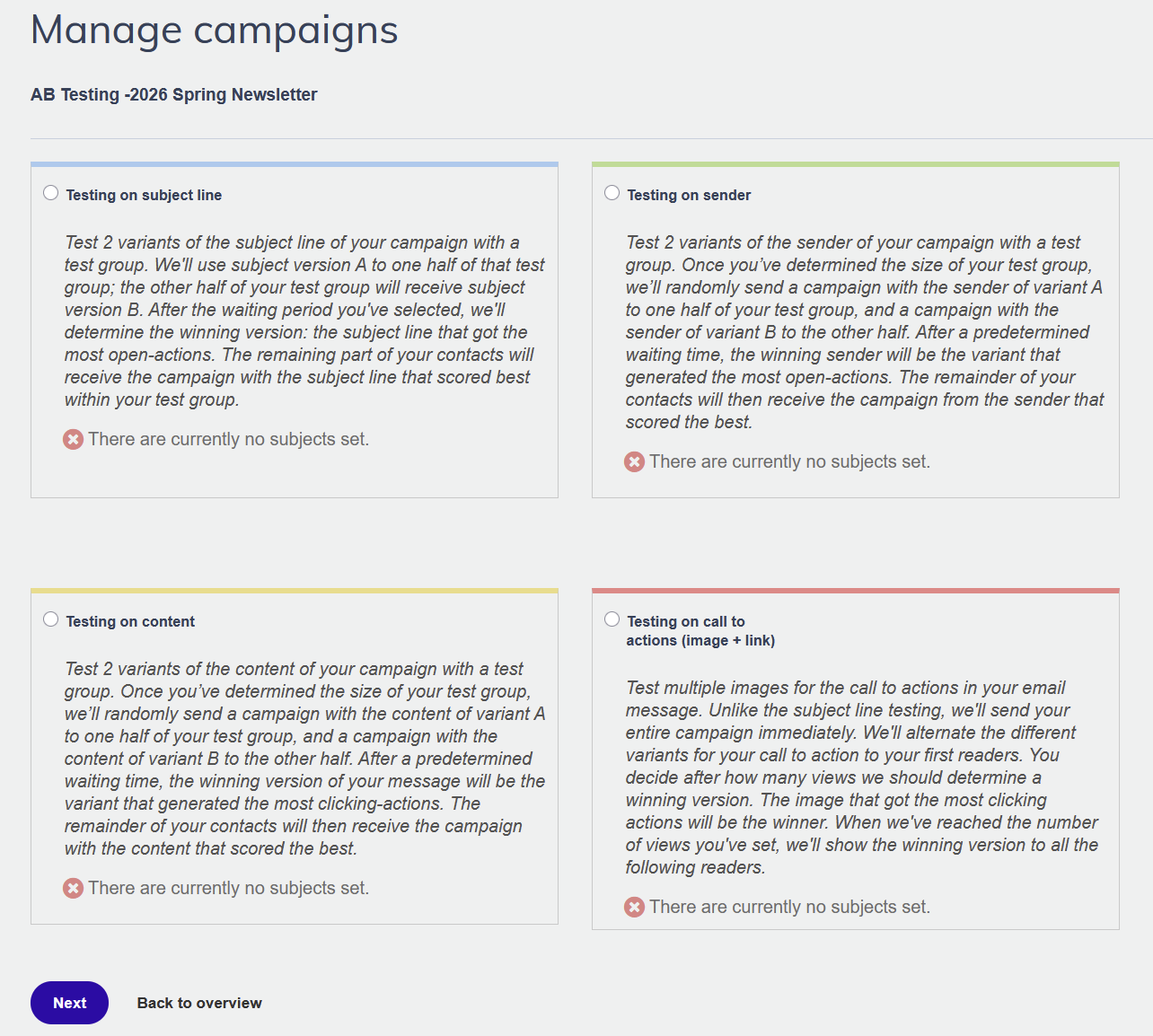 Attention You can only run one AB test type per campaign, and you can't change the type after the test has started.