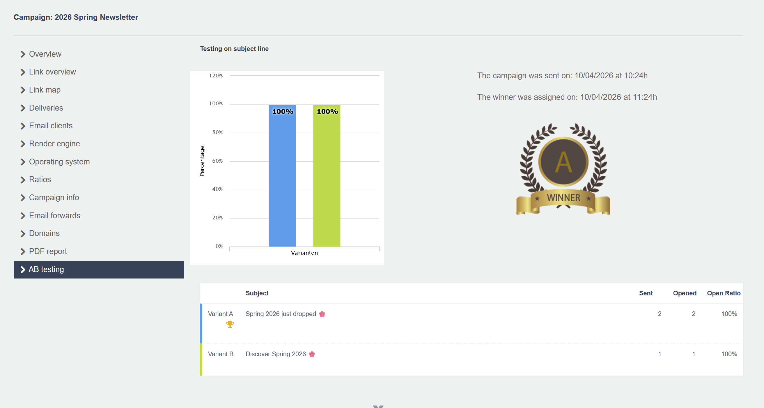 Once the test is complete, you'll find the results in the AB testing section of your campaign report. The winning variant is clearly marked, along with the open or click rate for each variant.