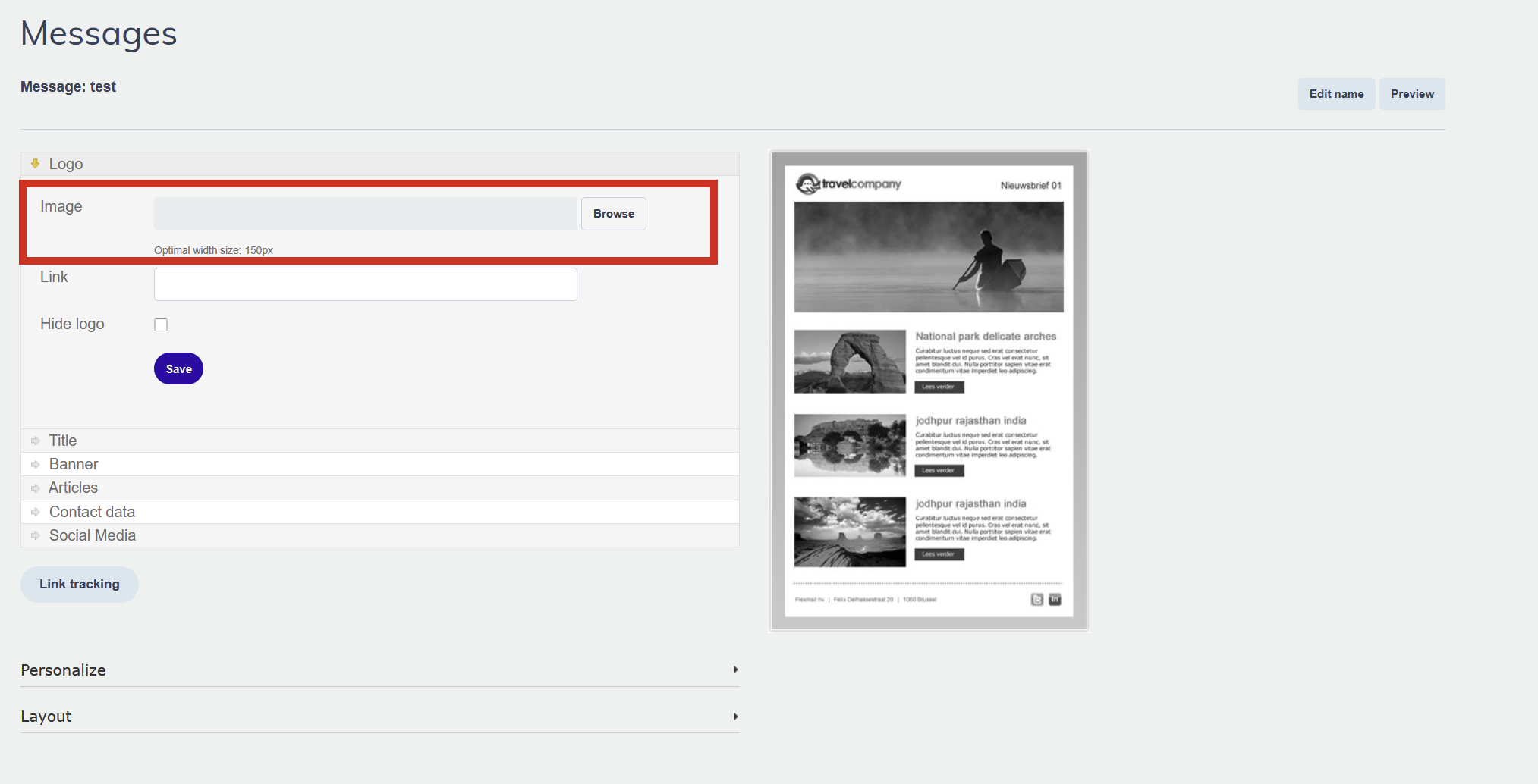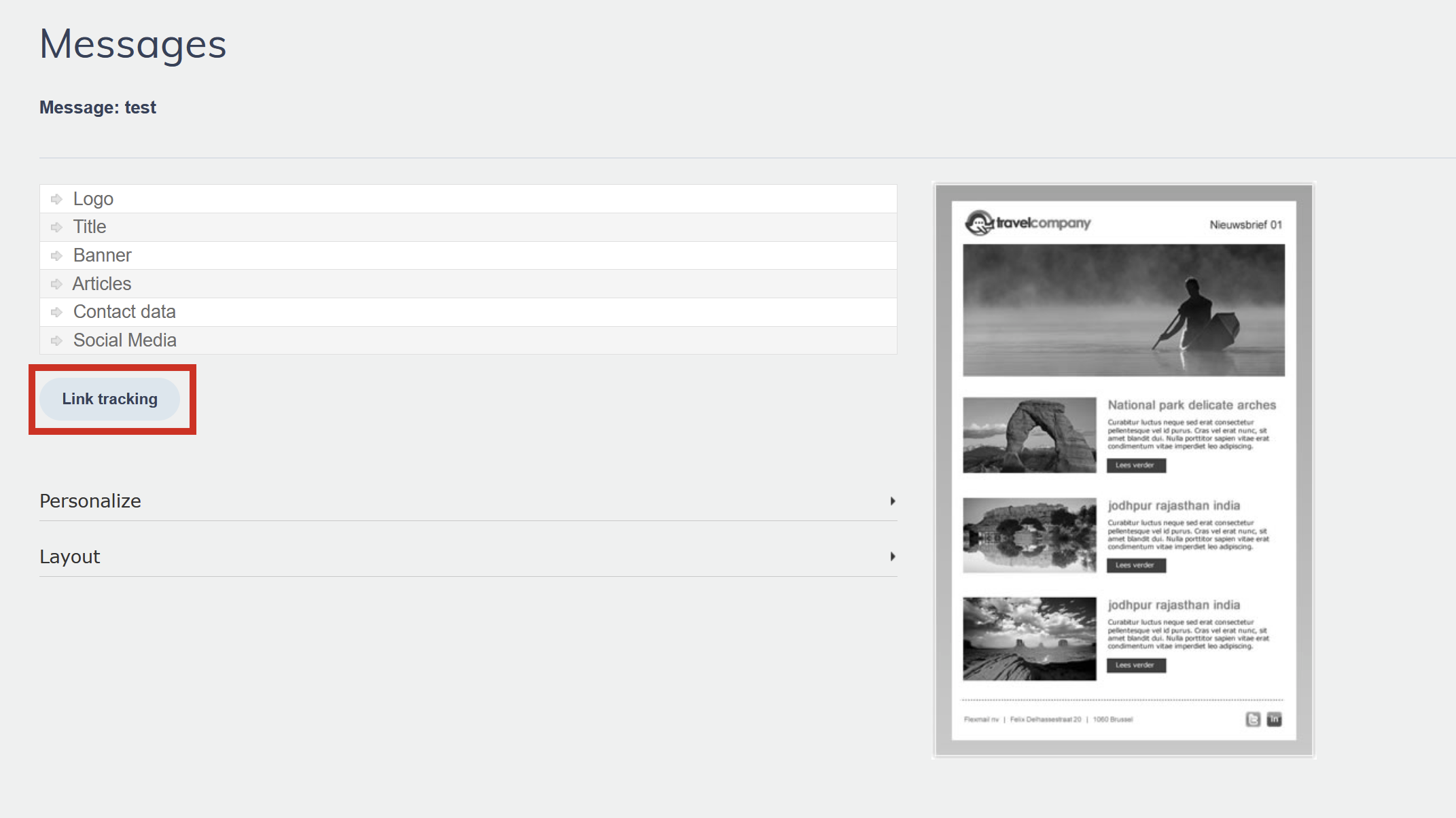 After finishing your message content, scroll down to find the Link tracking section. All links in your message are listed here. Enable or disable tracking per link and optionally assign an interest to each. See "Link tracking" for details.