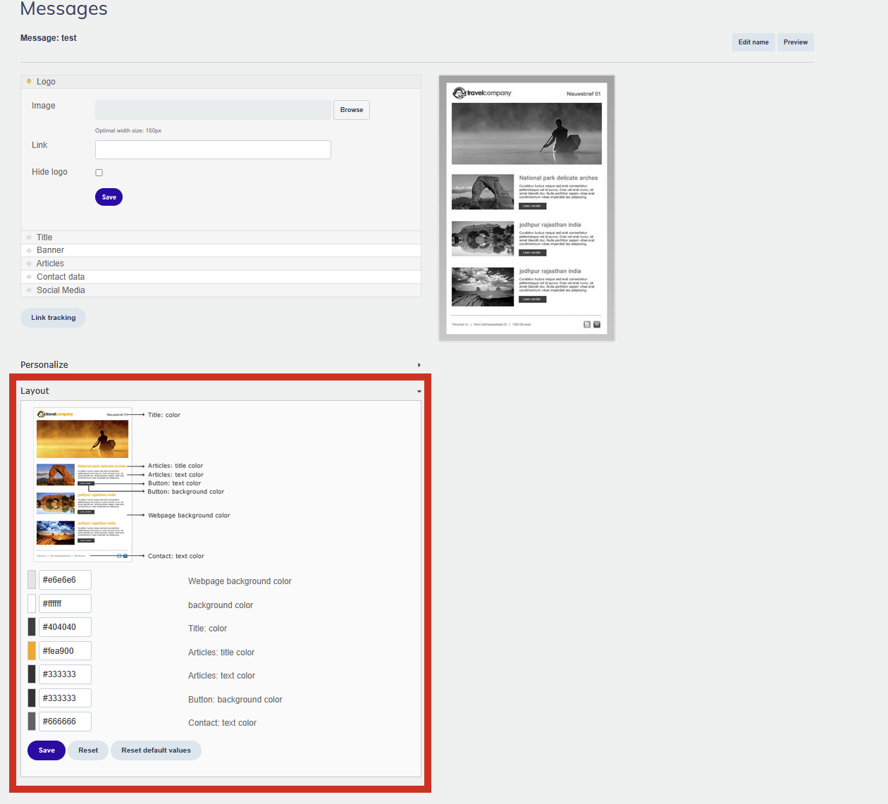 Click Preview at the top of the editor to see your message with test profile data applied. When you are satisfied, click Save. Your message is now available in your message list for use in a campaign.