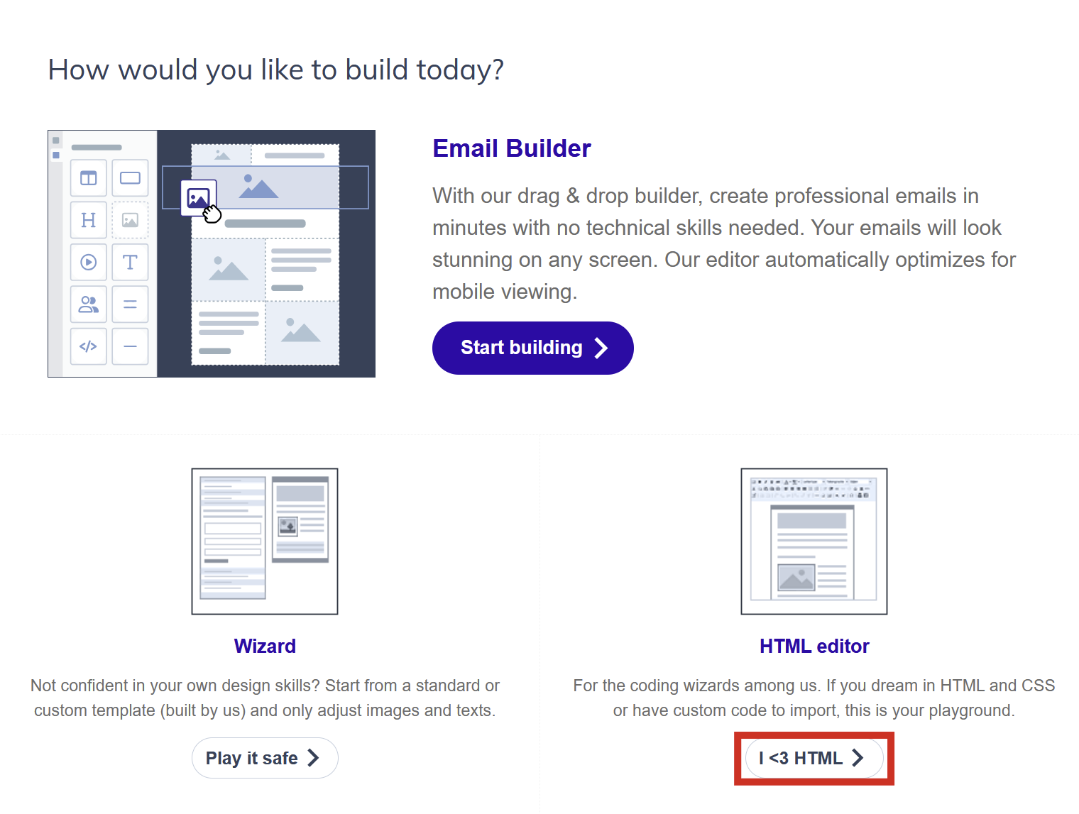 The HTML editor does not support drag-and-drop layout building or automatic mobile column stacking. For full layout control with no HTML knowledge required, use the Email builder. For a pre-designed mobile-responsive layout with minimal setup, use the Wizard Template.