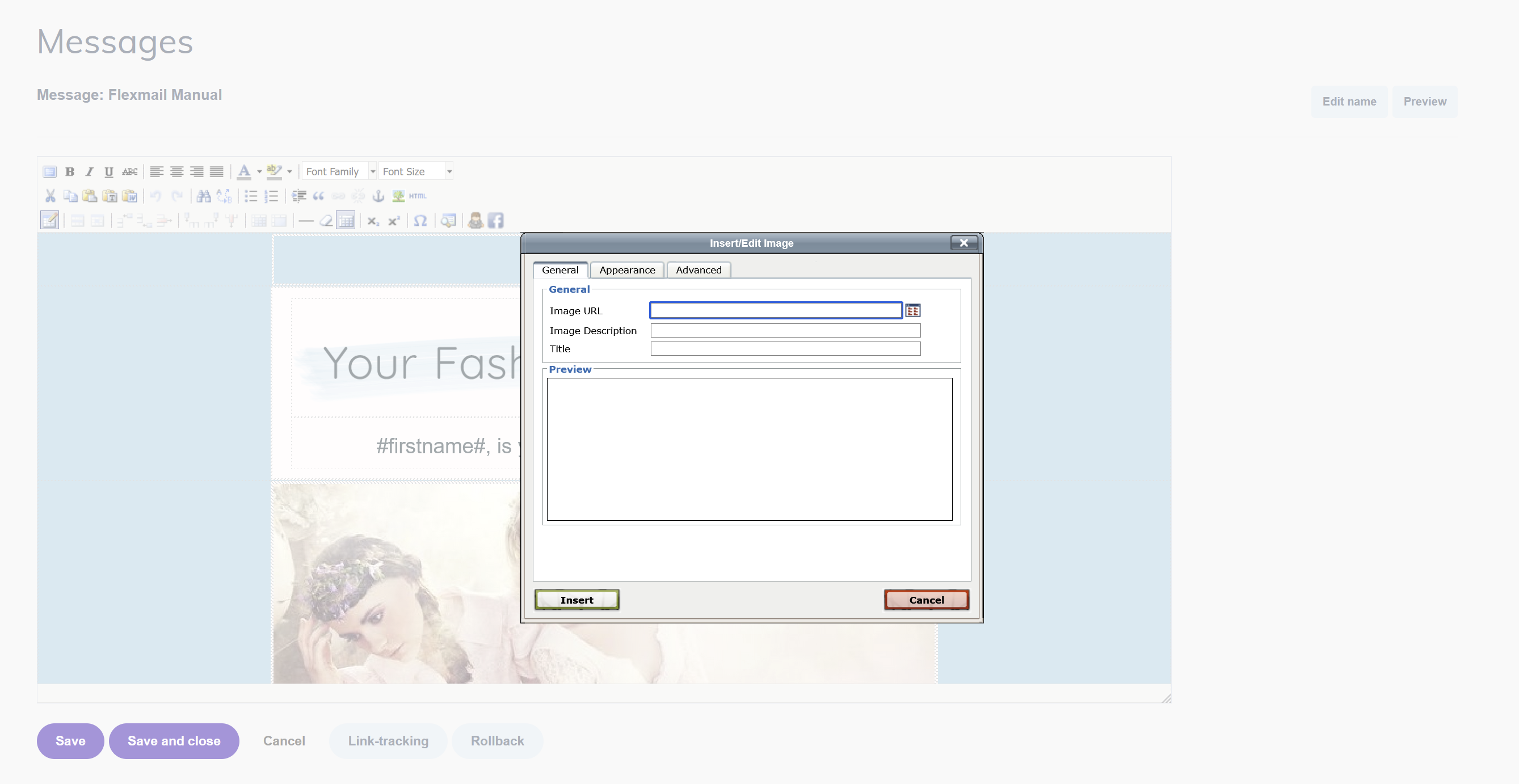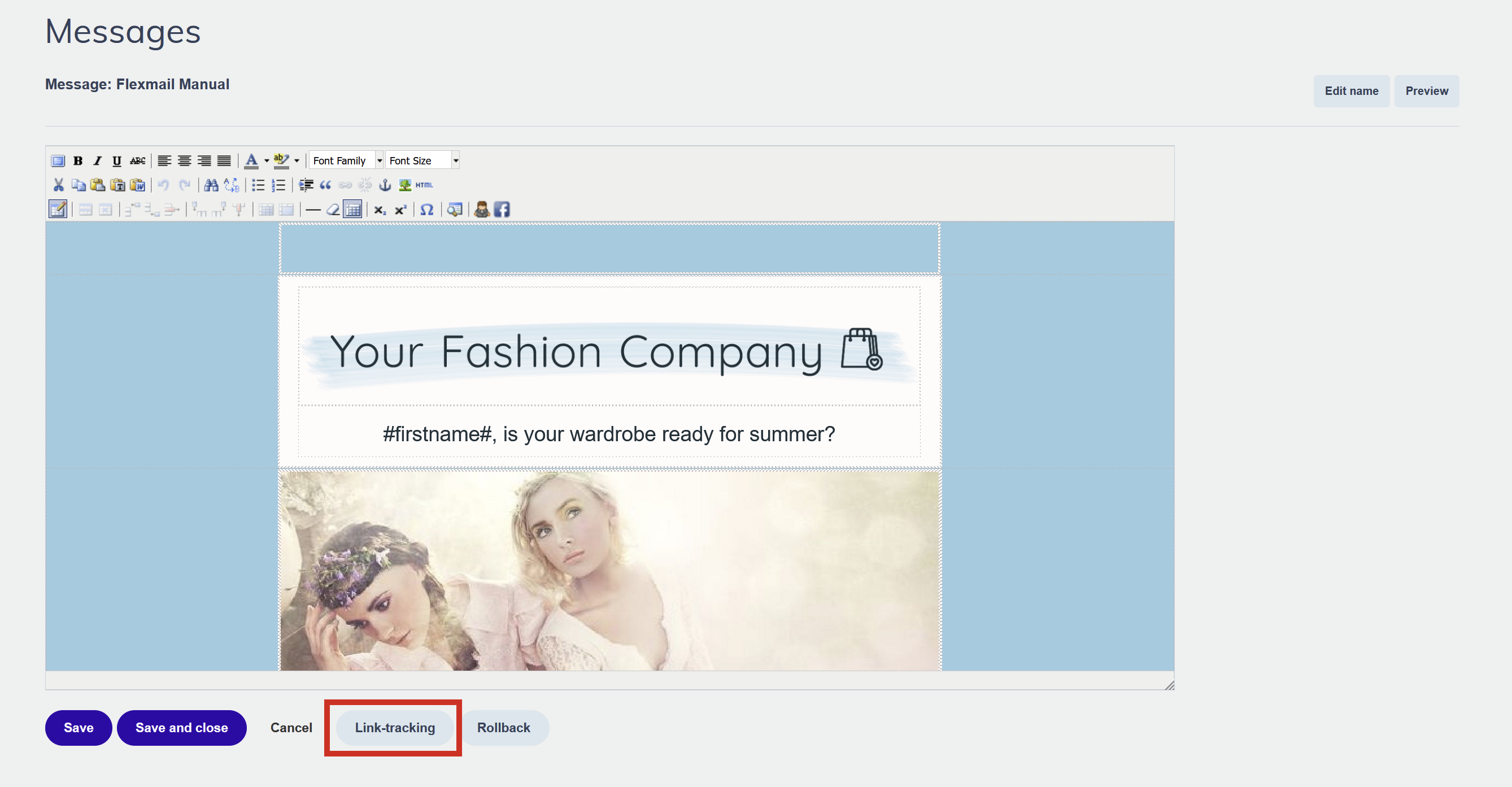 Click Preview to see your message with test profile data applied. When you are done editing, click Save. Each manual save creates a Rollback point, Flexmail keeps up to 10 versions.