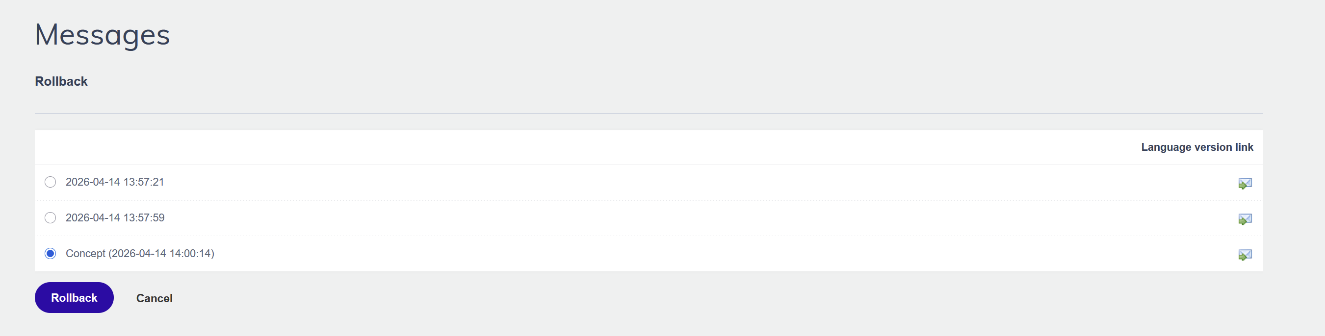 - See "Rollback function" in Message elements for step-by-step instructions on restoring a previous version.