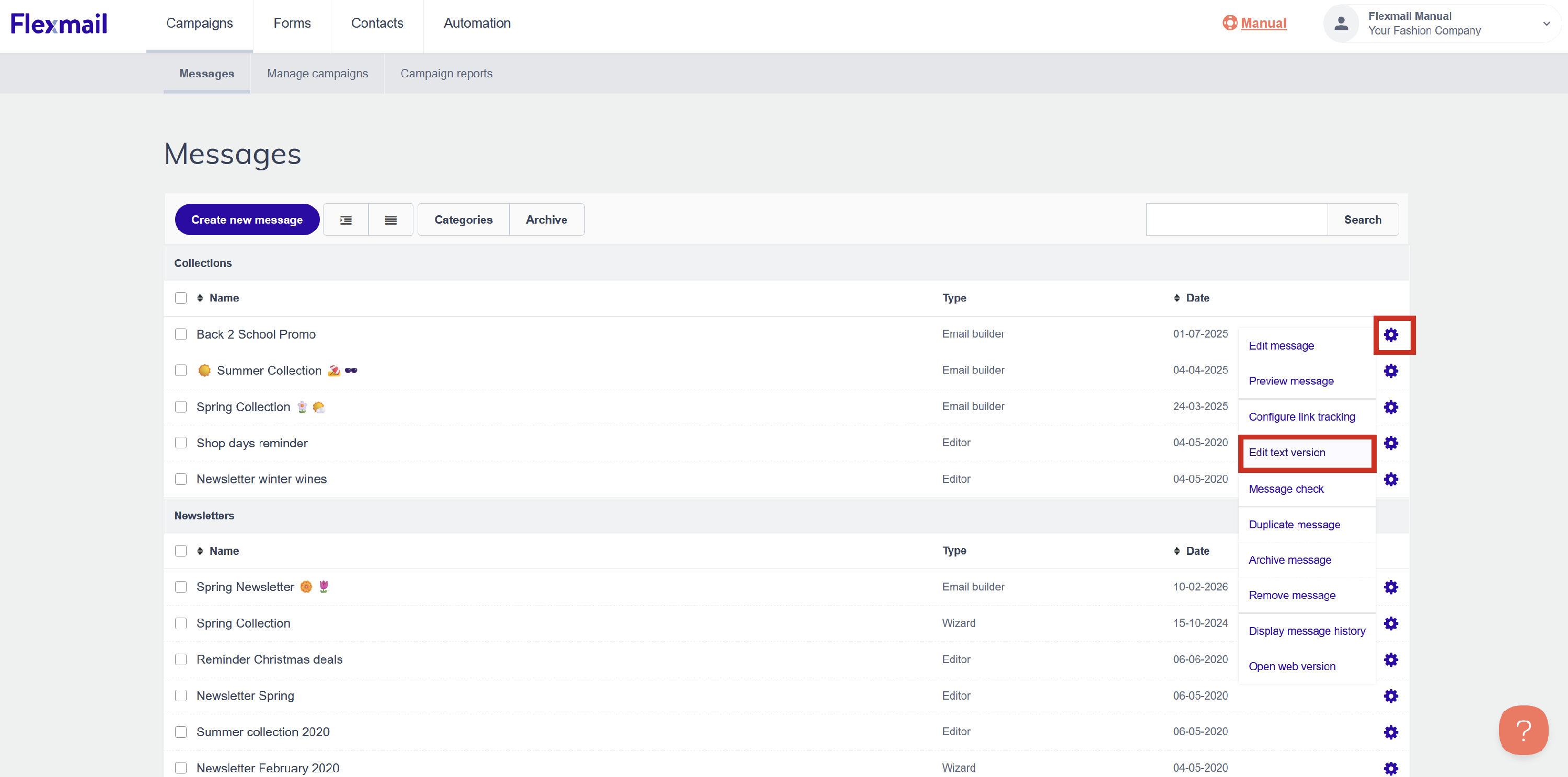 Flexmail can generate a text version automatically from your message. From your message list, click the gear icon next to your message and select "Edit text version" > Generate. Flexmail converts your message to plain text, titles and body text are preserved, images are replaced by their alt text, and button URLs appear at the end.