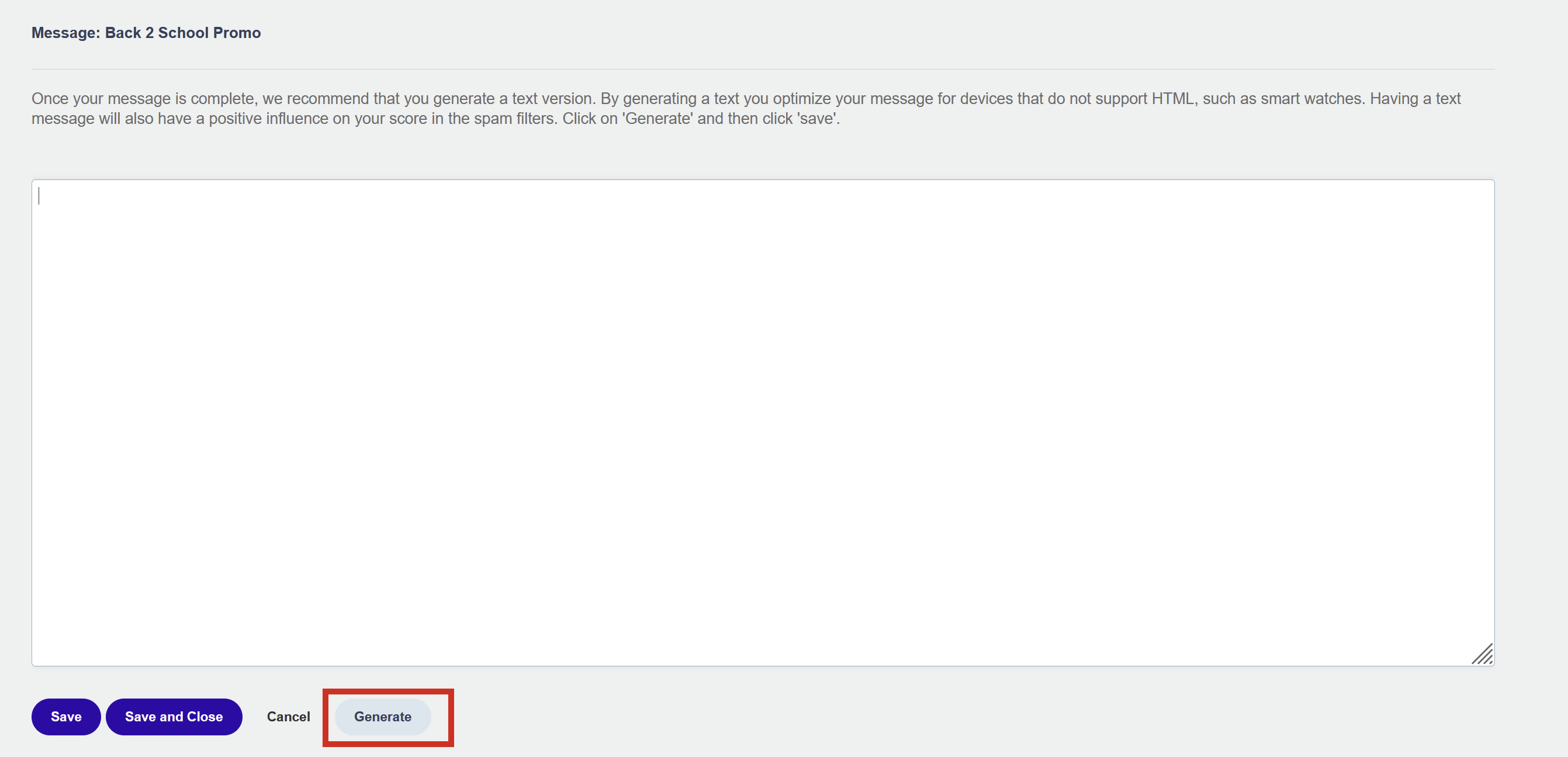 If you make significant changes to your message after generating the text version, regenerate it to keep the two versions consistent. A significantly out-of-date text version can trigger spam filters that look for discrepancies between the HTML and text content.