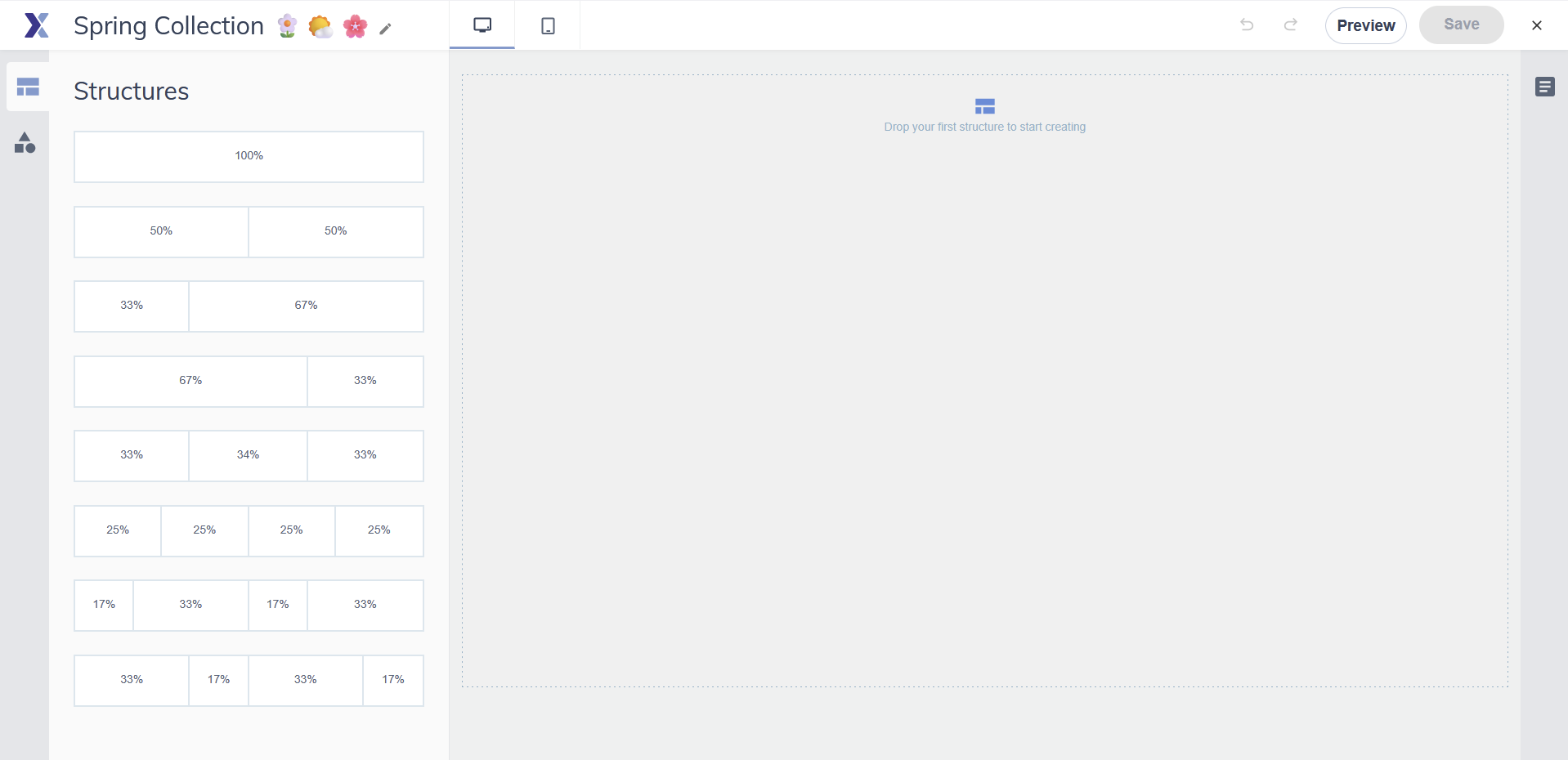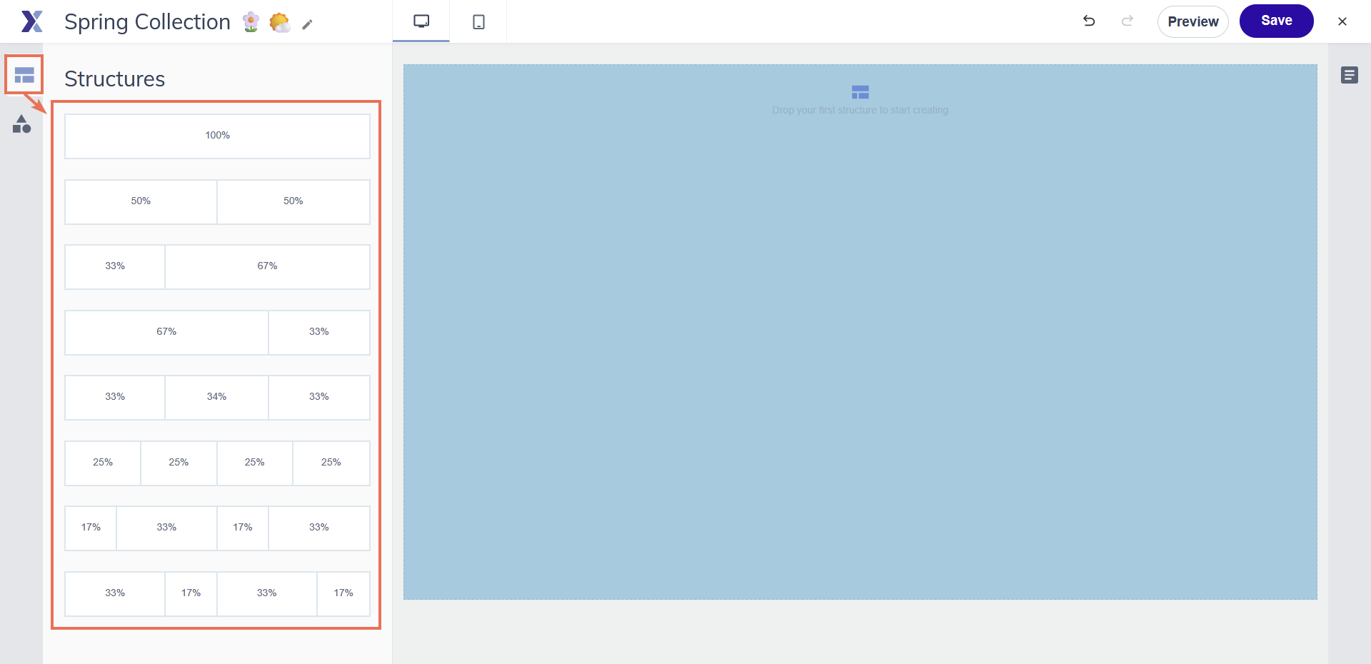 Open the Structures panel on the left. Find the column layout you want and drag it onto the canvas. A blue indicator line shows where it will land.