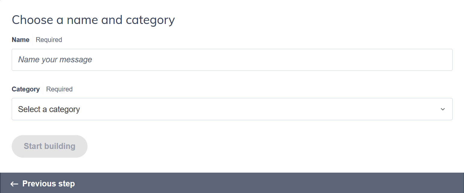 - Give your message a name and choose a category, then click Start building.