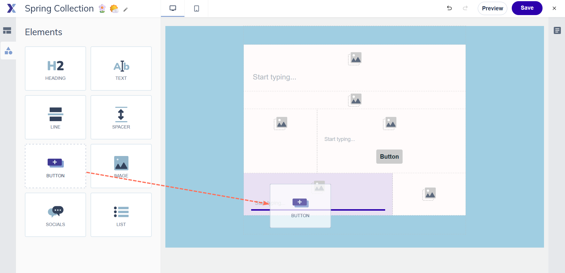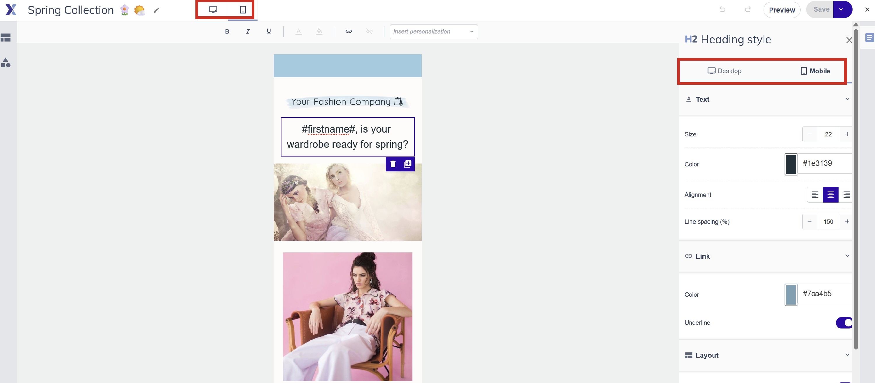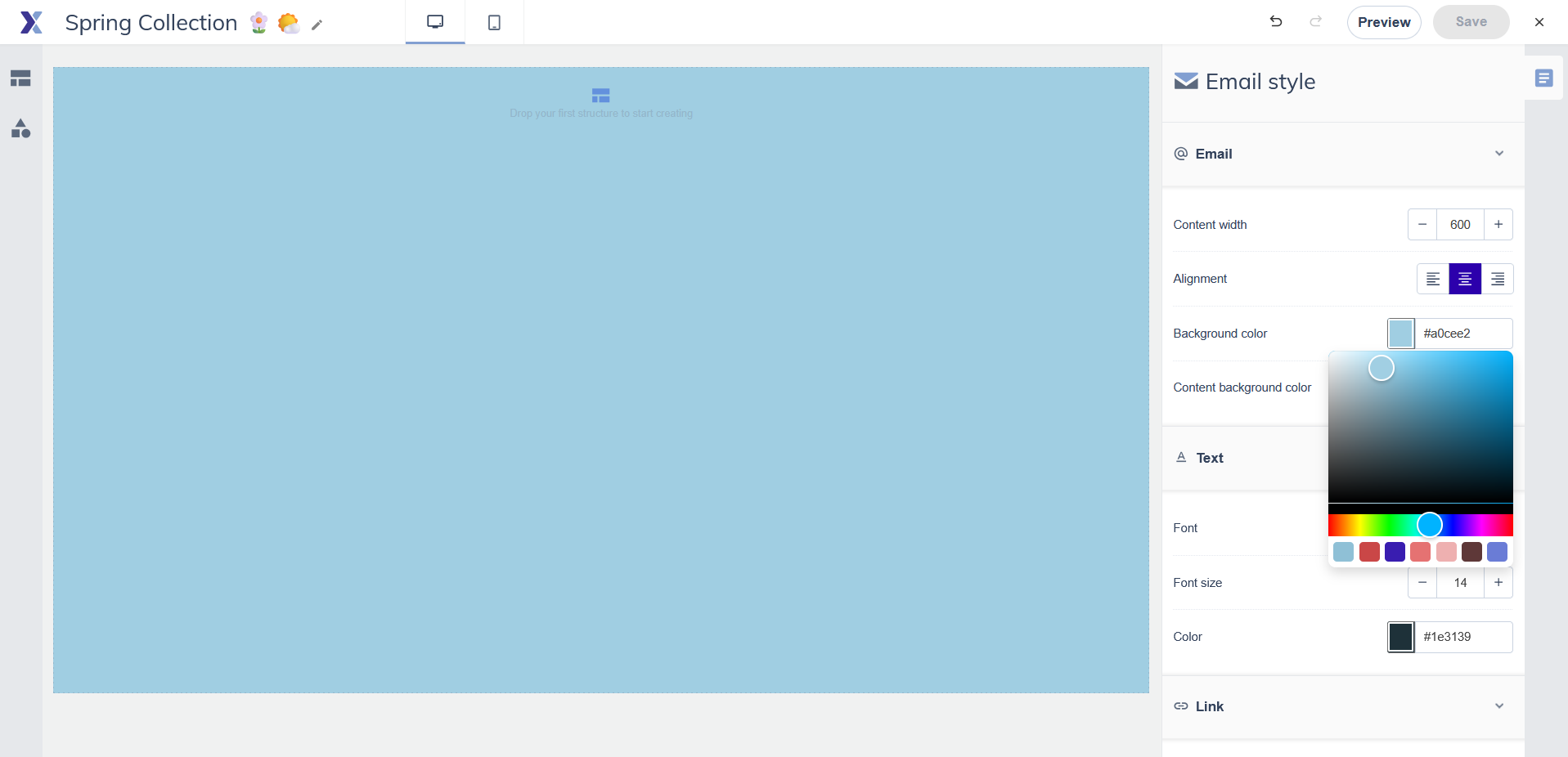 Use the desktop/mobile toggle at the top of the canvas to check how your email looks on both. Some elements can be configured to show or hide on specific device sizes from their settings panel.