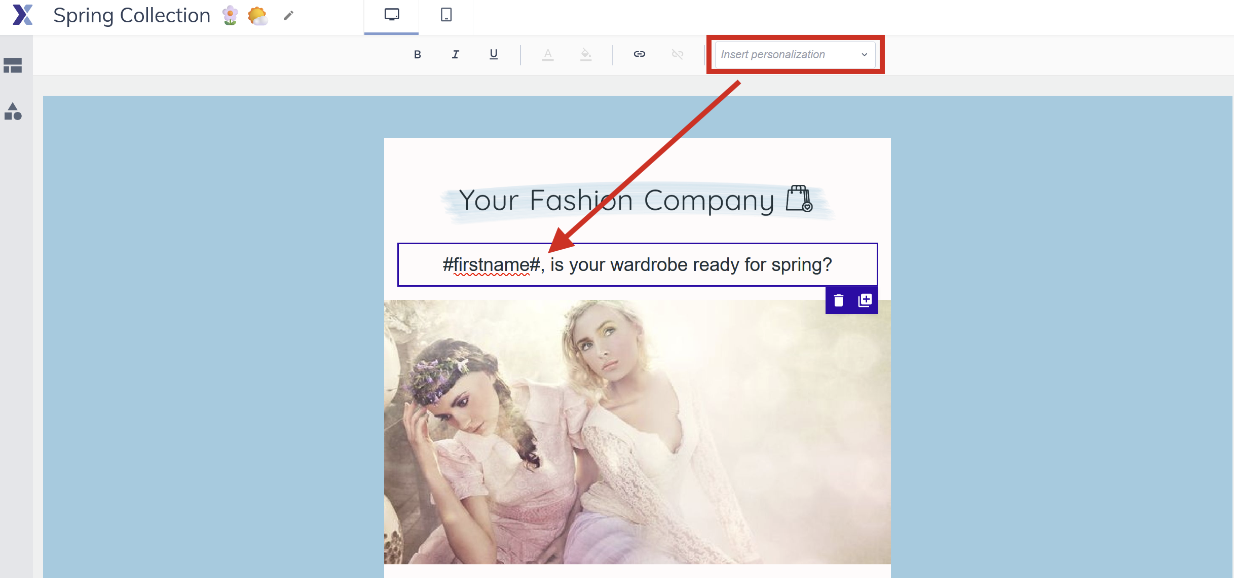 To personalise your message with contact data, place your cursor in a text element where you want the personalised content to appear. Click the placeholder icon in the text toolbar and select the field you want to insert, first name, company name, or any custom field. Placeholders look like #firstname# in the editor. When the email is sent, each placeholder is replaced with the actual value from that contact's record.