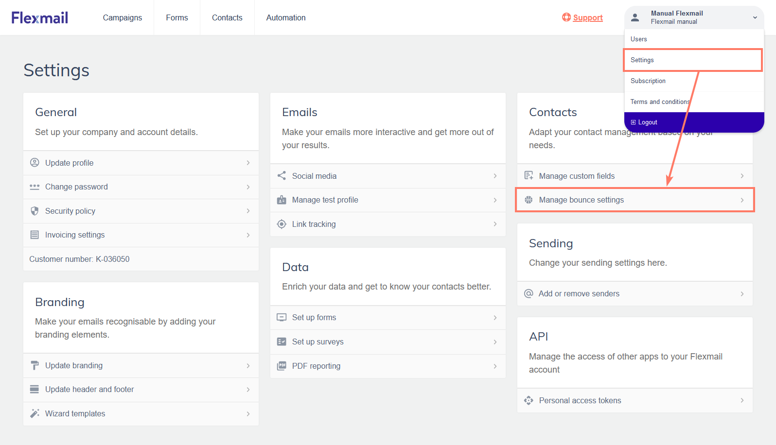Go to Settings, then Manage bounce settings.