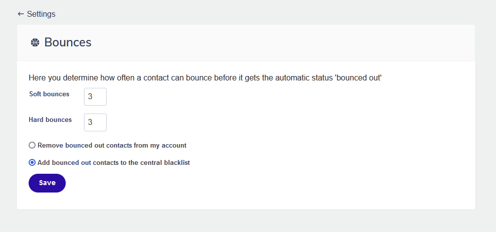 Flexmail automatically tracks email bounces and moves addresses that bounce repeatedly to your blacklist to protect your sender reputation and deliverability. In your account settings, you can configure how many bounces are allowed before a contact is considered bounced out.