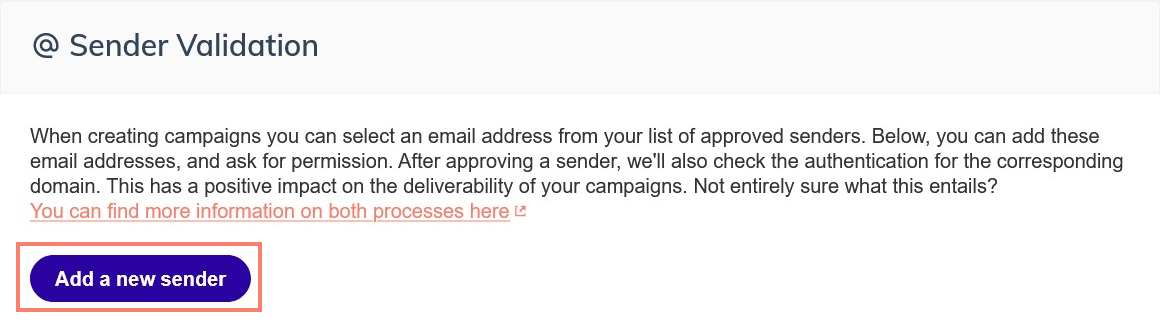 Attention - Make sure to use an email address that actually has an accessible inbox. A no-reply address, for example, often doesn't have a real mailbox behind it, which makes it impossible to complete the validation. We won't be able to validate the address for you, so keep this in mind when adding sender addresses.