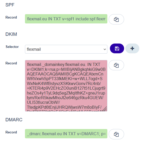 Red means means the record is not yet active. This could mean it still needs to be added to your domain's DNS, or, in the case of DKIM, that the key hasn't been installed on Flexmail's side yet (see step 5).