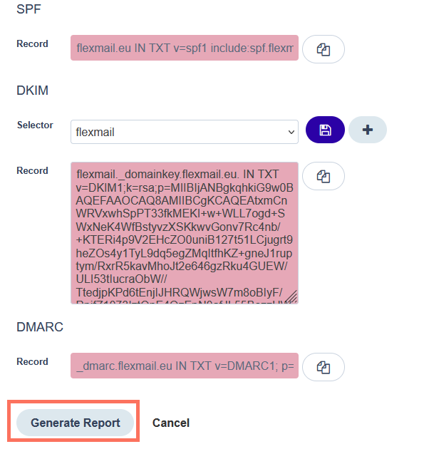 - The SPF and DMARC records are generated automatically by Flexmail. You don't need to do anything to generate them. They just need to be added to the DNS by your domain administrator.