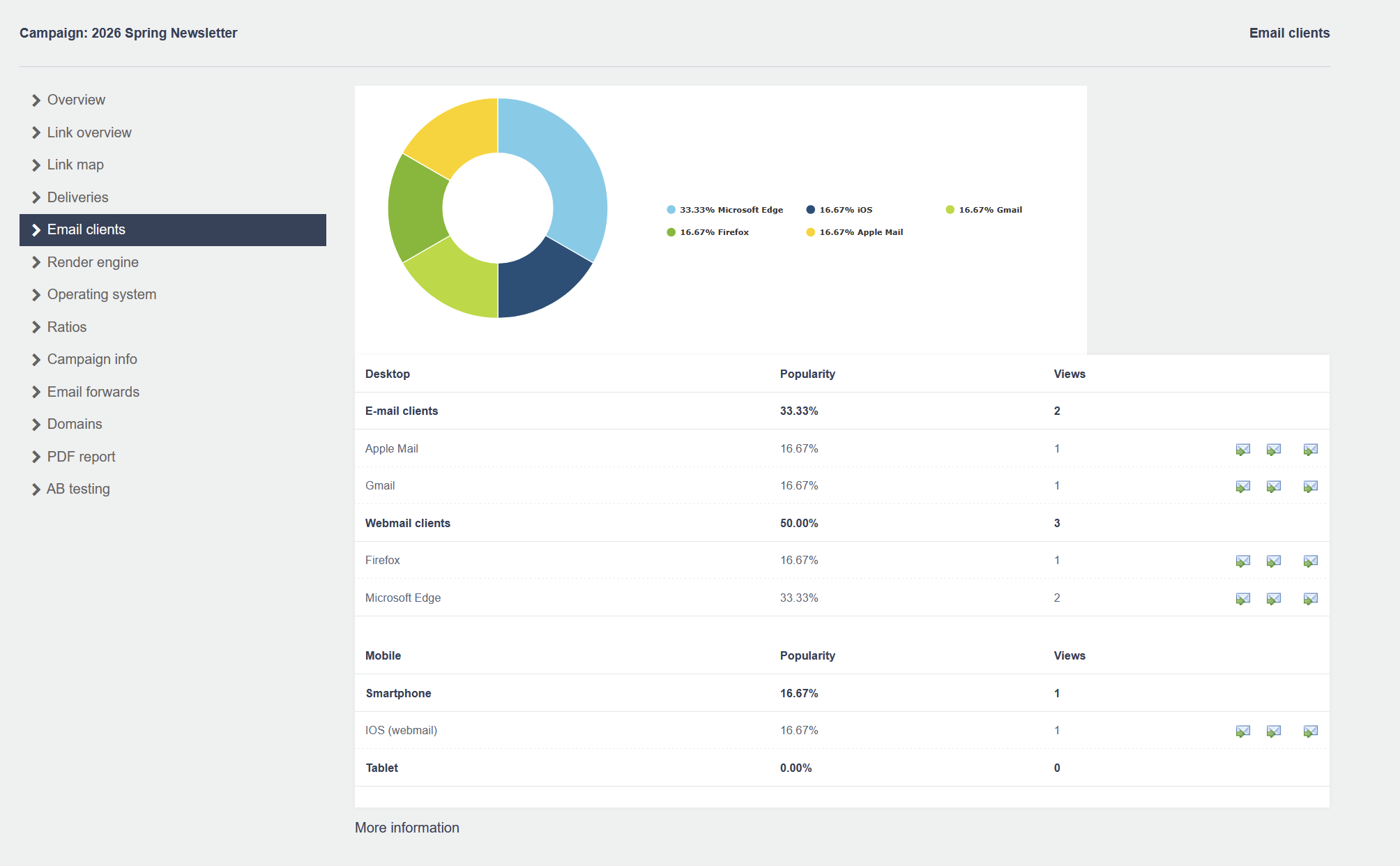 Open your test email on a desktop email client, a webmail interface, and a mobile device. Pay particular attention to the clients your contacts actually use, your campaign reports show this data under Email clients.